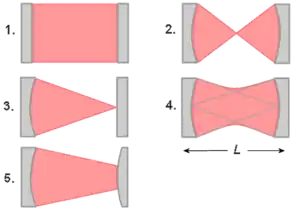 Con dos espejos esféricos de radios de curvatura R1 y R2, pueden ser realizadas muchas configuraciones de las cavidades. Si ambos espejos tienen el mismo centro (R1 + R2 = L), se forma una cavidad concéntrica. Mediante la sustitución de uno de los dos espejos por un espejo plano se obtiene una cavidad semiesférica.