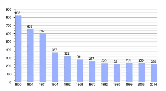 Los datos demográficos contemplados en este gráfico de la comuna de Celles[4] se han cogido de 1800 a 1999 de la página francesa EHESS/Cassini, y los demás datos de la página del INSEE.[5]