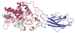 ![]() Una enzima celulasa producida por Thermomonospora fusca , con celotriosa unida en el surco poco profundo del dominio catalítico | ||||