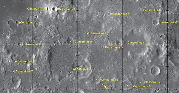 Por convención estos elementos son identificados en los mapas lunares poniendo la letra en el lado del punto medio del cráter que está más cerca de Censorinus.