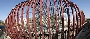 Chapas rigidas galvanizadas son apoyados por un sistema estructural secundario, capas de impermeabilización y la superposición exterior de paneles de aluminio rojo con aberturas para la ventilación y la evacuación de los humos. En el lado occidental, la cáscara desciende a la planta baja y revela un pasaje amplio iluminado que conduce al gimnasio, vestuarios y el patio interior abierto. La construcción fue terminada en septiembre de 2013.