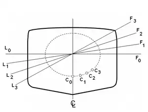 En el gráfico de la derecha se observa la curva descrita por el centro de carena C de un buque para las diversas condiciones de flotación L0-F0; L1-F1; L2-F3 y L3-F3.