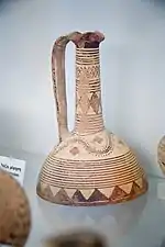 La decoración es muy simple, con múltiples y sutiles líneas paralelas en el cuerpo de la vasija y adornadas en zigzag, con trazos verticales u otros motivos geométricos (a veces figuras esquemáticas de pájaros) en el reverso. Rarísima vez aparece la figura humana, como en una famosa crátera del museo de Toronto.