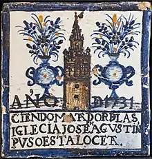En el siglo XVII se hicieron algunos templos que tenían en sus fachadas paneles de azulejos monocromos o policromos con imágenes cristianas.[37] Como ejemplos pueden citarse las iglesias de San José, San Jorge (del hospital de la Caridad)[37] y la iglesia del Colegio de San Francisco de Paula (actual iglesia del Sagrado Corazón de Jesús).[38] El desaparecido convento del Pópulo contaba con un azulejo de la Virgen del Pópulo del siglo XVII que se conserva en el Museo de Bellas Artes de Sevilla.[38] Estas representaciones religiosas colocadas en la calle fueron conocidas, ya desde el siglo XVIII, como retablos y los realizados con azulejos han sido llamados retablos cerámicos.[39]