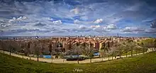 A la izquierda se ven algunos rascacielos del complejo AZCA: la torre Mahou, la torre BBVA, la torre Picasso y la torre Europa, a la derecha del todo se ven las torres KIO, el complejo Cuatro Torres estaría fuera de campo después de las KIO.