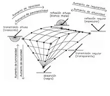 Los ejes de variación de la cesía son: permeabilidad a la luz (con los extremos transparente y opaco), difusividad (con los polos difuso y regular -o nítido) y oscuridad (con los extremos claro y oscuro -o negro).