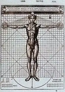 Cesariano interpretó las descripciones de Vitruvio basándose en la geometría de la arquitectura sacra medieval, muestra claramente las diferencias entre los tres modos de representación de edificios descritos por Vitruvio: planta (ichnographia), representación plana de la fachada (orthographia) y alzado en perspectiva (scaenographia). También y gracias al interés que tenía por la figura humana, ilustra el principio vitruviano de la symmetria, donde establece la equivalencia que se puede medir entre las proporciones de la figura humana y la arquitectura. Propuso una relación directa entre el círculo y el cuadrado: en donde el círculo rodea exactamente al cuadrado, y dentro de esa construcción la figura humana tiene que estirarse considerablemente para ajustarse a ella. Exactamente de igual manera, las partes de los templos deben guardar una proporción de simetría perfectamente apropiada de cada una de ellas respecto al conjunto total en su completa dimensión.