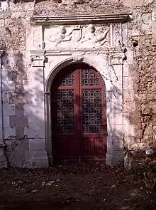 Un pequeño edículo en tufa blanca, tallada en el estilo de la cerámica de Andrea della Robbia, ocupa el fondo de la cavidad. Incluye: un panel enmarcado por dos pilastras decoradas con rollos (figurando pájaros, arcos y flechas y varios símbolos religiosos y profanos), una coronación por un arco decorado con roleos y rematado con un florero en bajorrelieve donde figura una "cabeza de Magdalena", una consola de roleos esculpida con un escudo vacío de armas y un pedestal cuyo dado está tallada con dos diablotinos. Este edículo, de estilo italiano, no tiene ningún equivalente en Turena. Además, un blasón en mal estado con las armas de René de Saboya permanece en una de las pilastras.