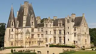 El primer gótico, muy sencillo, fue rápidamente sustituido por el gótico flamígero y después por el primer renacimiento francés. Pero el elemento más curioso del castillo está a la izquierda de esta fachada, en la que destaca una superposición de columnas, que una inscripción data precisamente en 1537, que parece muy temprana para tal realización.