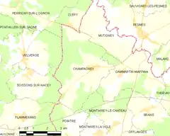 - Situación de Champagney (Jura) en un mapa de Francia y de comunas limítrofes (enlace roto disponible en Internet Archive; véase el historial, la primera versión y la última). (en francés)