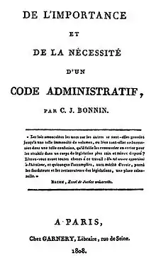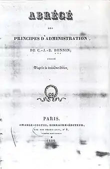 Bonnin, Charles-Jean Baptiste (Francia, 4 de octubre de 1772 - octubre de 1846) fue un pensador político y social, autor progresista de la Revolución Francesa y de la primera mitad del siglo XIX, y padre fundador de la ciencia de la Administración Pública.[1] Se desprende de la obra escrita de Bonnin una gran actividad política e intelectual. Su trabajo académico lo acredita como precursor del derecho público, del derecho constitucional y del derecho administrativo. Incluso, su Doctrina Social debe situarlo entre los iniciadores de lo que después sería conocida como la sociología. También practicó la crónica parlamentaria y se interesó por los problemas educativos. Auguste Comte describió a Bonnin como “un hombre maduro y enérgico, una persona con profunda afinidad espontánea con el positivismo y en quien se puede encontrar el verdadero espíritu de la Revolución”.[2]