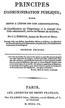 - Principes d'Administration Publique, por servir a l’Études des Lois Administratives, et Considérations sur l’Importance et la Nécessité d’un Code Administratif, suvies du Project de ce Code. Obvrage utile aux Préfets, Sous-Préfets, Maires et Adjounts, aux Membres des Conseils généraux de départaments, de préfectures, d’arrondissemenns, communaux et municipaux. A Paris, chez Clement Frères, Libraires. 1809. Seconde édition.