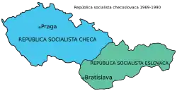 - 1960-1992: 10 regiones (kraje), la ciudad de Praga, y (desde 1970) la ciudad de Bratislava, los cuales estaban divididos de 109 a 114 okresy. Los kraje se suprimieron temporalmente en Eslovaquia entre 1969 y 1970 y desde fines de 1991 en toda Checoslovaquia; Además, la República Socialista Checa y la República Socialista Eslovaca fueron establecidas en 1969 (el nombre socialista fue retirado en 1990).