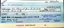 Un cheque (anglicismo del término cheque o check) es un documento contable que consiste en un derecho de pago en el que la persona que es autorizada para extraer dinero de una cuenta (por ejemplo, el titular), extiende a otra persona una autorización para retirar una determinada cantidad de dinero de su cuenta, la cual se expresa en el documento, prescindiendo de la presencia del titular de la cuenta bancaria.