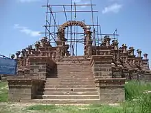 - el significado usual y más ampliamente entendido es el de un monumento conmemorativoo memorial, por lo general muy recargado, construido sobre el lugar donde se realizó el funeral (cremación) de un hombre importante. Tales monumentos conmemorativos por lo general consisten en una plataforma ceñida por un conjunto de pilares adornados, que sostienen un dosel de piedra.