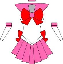 Como Sailor Chibi Moon, ella viste un traje igual al de Sailor Moon, aunque con la falda y los moños de color rosado. A medida que Sailor Chibi Moon adquiere nuevas transformaciones (como la de "Super" y "Eternal" sólo en el manga) y se vuelve más poderosa, se le van agregando nuevos detalles a su traje de justiciera. Al igual que Sailor Moon, Chibi Moon siempre utiliza un cetro u otro accesorio determinado durante las batallas. En el manga y en Sailor Moon Crystal, ella tiene su propio Cristal de Plata; el cual es parte de su ser así como la fuente del poder que ella utiliza para luchar. Este cristal evoluciona hasta revelar completamente su forma como un cristal sailor, con el nombre de "Pink Moon Crystal",[23][24] ("Cristal de Luna Rosa" o "Cristal Rosa de la Luna")[25] hacia el final de la cuarta temporada;[26] tras lo cual el personaje adquiere su forma más poderosa como justiciera, "Eternal" Sailor Chibi Moon,[6] y empieza a mostrar su más alto nivel de pelea, hasta el final de la serie.