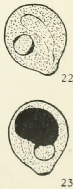 - Quiste: presenta un tamaño en torno a 10 μm de longitud y una morfología ovalada. No presenta flagelos ni citostoma, aunque se pueden llegar a apreciar restos de estas estructuras como los axonemas intracitoplasmáticos. Tiene un único núcleo que se dispone más o menos en la zona central. El quiste es la forma vegetativa infectante y de resistencia.