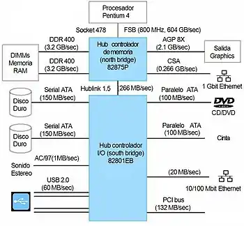- El puente norte, northbridge, MCH (memory controller hub) o GMCH (graphic MCH), se usa como puente de enlace entre el microprocesador y la memoria. Controla las funciones de acceso hacia y entre el microprocesador, la memoria RAM, el puerto gráfico AGP o el PCI-Express de gráficos, y las comunicaciones con el puente sur.[3] Al principio tenía también el control de PCI, pero esa funcionalidad ha pasado al puente sur.