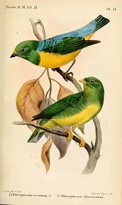 ![]() Clorofonia acollarada (abajo), ilustración por Joseph Smit, 1886 | ||