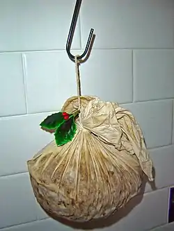 Christmas pudding se suele dejar secar colgado de un gancho durante semanas para reforzar su sabor. Este pudding ha sido preparado con un paño de la forma tradicional en lugar de una palangana.