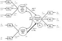 - Modelo estructural. La ecuación de demostración describe la medición del modelo de Ciber TAC y cómo la variable latente de guardián digital tuvo coeficientes de regresión no normalizados estadísticamente significativos. La relación estadística negativa entre el guardián digital y la victimización por delito se ilustra mediante el coeficiente de regresión no normalizado estadísticamente significativo de -75. El coeficiente estandarizado de -74 también revela que el guardián digital es el factor más importante en la victimización por delitos informáticos. Entre las variables observadas por los guardianes digitales, los coeficientes estandarizados indican que tanto el equipamiento del número de software de seguridad informática como la duración de la presencia del software de seguridad informática proporcionan casi un impacto sustancial en minimizar la victimización por delitos informáticos. Estos hallazgos apoyan suficientemente el componente teórico (la custodia competente) de las actividades cotidianas al enfatizar en que la seguridad informática contribuye a reducir la victimización por delitos informáticos.[1]