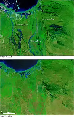 Después de tocar tierra, el ciclón tropical Larry se movió sobre el noroeste de Queensland del 22 al 23 de marzo de 2006, con fuertes lluvias en toda la región. La estación de Gereta, al norte del monte Isa, registró 583 mm de lluvia en las 48 horas hasta las 9 de la mañana del 23 de marzo de 2006.[18] Se informó de fuertes inundaciones a lo largo del río Leichhardt aguas abajo, lo que provocó la inundación de algunas propiedades ganaderas.[19]