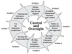 El equipo de arquitectura también genera un plan de secuencia para la transición de sistemas, aplicaciones, y prácticas de negocios asociadas que son indicadas en un análisis detallado. La arquitectura se emplea en el control de la planificación de capital e inversión. Los procesos de ingeniería de la empresa y el programa de gestión de procesos se realizan a través de proyectos priorizados, proyectos incrementales y la inserción de nuevas tecnologías emergentes. Por último, las arquitecturas se mantienen mediante una modificación continua para reflejar la base actual de la empresa y los objetivos de negocio, metas organizacionales, visiones, tecnología e infraestructura.[1]
