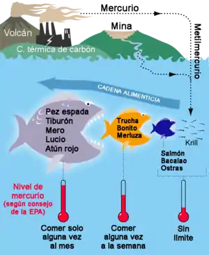 Los peces y bivalvos concentran mercurio en sus organismos, a menudo como metilmercurio, un compuesto orgánico del mercurio que es sumamente tóxico. Las investigaciones realizadas han permitido determinar que los productos marinos pueden contener concentraciones diversas de metales pesados, particularmente mercurio y contaminantes solubles en grasas provenientes de la contaminación del agua. Las especies de peces que son longevas y que ocupan un sitial elevado en la cadena alimentaria contienen concentraciones de mercurio más elevadas que otras especies. La presencia de mercurio en los peces puede tener repercusiones sobre la salud de los seres humanos, especialmente de aquellas mujeres que están embarazadas o que pueden quedar embarazadas, madres que están dando el pecho, y bebés (véase envenenamiento por mercurio).