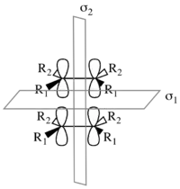 Considerando solo la cicloadición [π2s+π2s], el mecanismo conduce a una retención de la estereoquímica en el producto, como se ilustra a la derecha. Hay dos elementos de simetría presentes en los materiales de partida, el estado de transición y de productos: σ1 y σ2. σ1 es el plano de simetría entre los componentes perpendiculares a los orbitales p; σ2 divide las moléculas en un plano perpendicular a los enlaces-σ.[2]