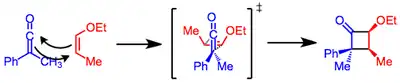 La configuración estereoquímica de la olefina se conserva en el producto de cicloadición. Los sustituyentes electroatractores en la cetena y los electrodadores en el alqueno aceleran la reacción,[16] pero las cetenas disustituidas reaccionan lentamente debido al impedimento estérico.[17]