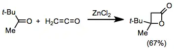 Además, reaccionan con aldehídos y cetonas para dar β-lactonas. Es necesario usar un ácido de Lewis para que catalice el proceso, a no ser que el carbonilo posea algún grupo buen electroatractor como sustutuyente:[19]