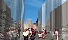 Algunos observadores señalaron que el monumento "recuerda al monumento conmemorativo de la guerra de Vietnam de Maya Lin en Washington",[7] con sus paredes llenas de nombres, enumerados al alcance de la mano y grabados lo suficientemente profundos como para que sea posible frotar las manos, pero uno de los muchos Las diferencias entre ese diseño y este serán la forma en que el monumento conecta visualmente a Nueva Jersey con el skyline de Nueva York, con los muros conmemorativos que simbolizan las torres gemelas derribadas al otro lado del río Hudson.