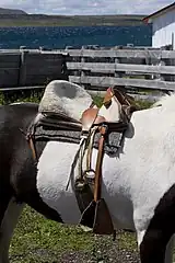 - cincha forcada se divide por cada uno de sus extremos en dos puntas que, con sus hebillas, está siempre pendiente de los contrafuertes del lado derecho de la silla y viene por el otro lado abrazando la cinchera del caballo a enhebillarse, por las otras dos puntas, en los contrafuertes del lado izquierdo