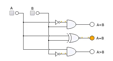 Pero por deducción, se puede concluir que: si A=B es FALSO y A>B es FALSO, entonces A<B es VERDADERO lo que sería igual a H(A,B)= [F(A,B)]‘[G(A,B)]‘. Si se implementa la conclusión anterior mediante compuertas lógicas entonces se habría un gran ahorro de trabajo en el diseño y construcción del circuito.