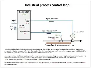 El diagrama adjunto muestra un bucle de control con una sola entrada PV, una función de control y la salida de control (CO) que modula la acción del elemento de control final (FCE) para alterar el valor de la variable manipulada (MV). En este ejemplo, se muestra un bucle de control de flujo, pero puede ser el nivel, la temperatura o cualquiera de los muchos parámetros del proceso que deben controlarse. La función de control que se muestra es un "tipo intermedio", como un controlador PID, lo que significa que puede generar un rango completo de señales de salida en cualquier lugar entre 0 y 100%, en lugar de solo una señal de encendido/apagado.[1]