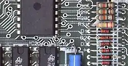 En electrónica, una placa de circuito impreso es una superficie constituida por caminos, pistas o lapizes de circuitos buses de material conductor laminadas sobre una base no conductora. El circuito impreso se utiliza para conectar eléctricamente a través de las pistas conductoras, y sostener mecánicamente, por medio de la base, un conjunto de componentes electrónicos. Las pistas son generalmente de cobre, mientras que la base se fabrica generalmente de resinas de fibra de vidrio reforzada, cerámica, plástico, teflón o polímeros como la baquelita.