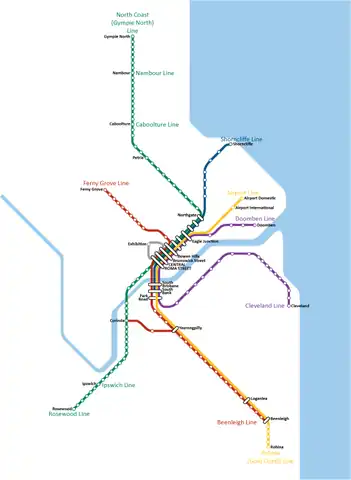 - Línea Cleveland – entre la estación central de Brisbane y Cleveland, comprende 23 estaciones y 37,3 km de extensión.