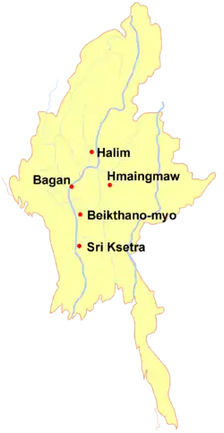 Alrededor del siglo II a. C., el pueblo Pyu que hablaba lenguas tibetano-birmanas comenzó a entrar en el río Irrawaddy desde el actual Yunnan usando los ríos Taping y Shweli. El hogar original de los Pyu se reconstruye para ser el Lago Qinghai, que se encuentra en las actuales provincias de Qinghai y Gansu.[6] Los Pyu, los primeros habitantes de Birmania de los que existen registros, fundaron asentamientos en toda la región de las llanuras centrada en la confluencia de los ríos Irrawaddy y Chindwin que ha estado habitada desde el Paleolítico.[7][8] El reino de Pyu era más largo que ancho y se extendía desde Sri Ksetra en el sur hasta Halin en el norte, Binnaka y Maingmaw al este y probablemente Ayadawkye al oeste. Los registros de la dinastía Tang reportan 18 estados Pyu, nueve de los cuales eran ciudades amuralladas, cubriendo 298 distritos.[9]