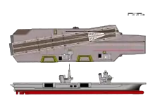 - Debido a los crecientes costes del programa F-35 y a las prestaciones de los distintos modelos también se anunció que el portaaviones operativo, si tendrá instalado catapulta y cables de aterrizajes (CATOBAR) para dar cabida a la variante F-35C del Joint Strike Fighter, en lugar del primer diseño F-35B STOVL.[21][22]