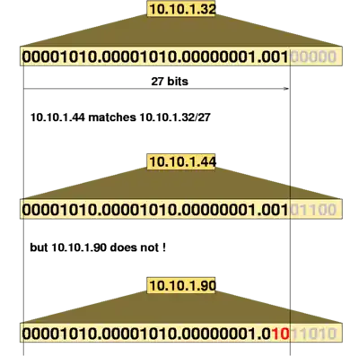 Decimos que una dirección IP está incluida en un bloque CIDR, y que encaja con el prefijo CIDR, si los N bits iniciales de la dirección y el prefijo son iguales. Por tanto, para entender CIDR es necesario visualizar la dirección IP en binario. Dado que la longitud de una dirección IPv4 es fija, de 32 bits, un prefijo CIDR de N-bits deja bits sin encajar, y hay combinaciones posibles con los bits restantes. Esto quiere decir que direcciones IPv4 encajan en un prefijo CIDR de N-bits.