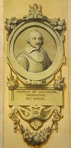 - Fue enterrado con su esposa en la iglesia de Notre-Dame-en-Vaux. Un mauvais relevé de l'épitaphe portée sur sa pierre tombale a été source de controverses sur son prénom et sa date de naissance. De nombreuses publications l'ont ainsi appelé à tort Jean ou Nicolas, le faisant naître en 1547. Il est même parfois fait référence à un frère du topographe inhumé dans l'église. Une recherche rigoureuse menée par Jean-Pierre Ravaux en 1998, publiée dans son ouvrage Claude Chastillon et sa topographie française, basée sur de nombreuses archives d'époque, lève toute ambiguïté sur la question.