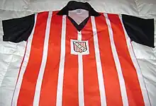 - Uniforme titular: Camiseta blanca con bastones verticales rojos, pantalón y medias blancos.