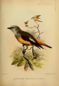 - Sclater, P.L. (1851). «On two new species of Birds of the genus Taenioptera». Proceedings of the Zoological Society of London (en inglés y latín). Pt. 19 no. 231: 193–194. Taenioptera erythropygia p. 193; pl. 41. Disponible en Biodiversitas Heritage Library. ISSN 0370-2774.