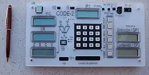 En la definición del repertorio de instrucciones máquina y en el desarrollo de CODE-2 colaboraron, con el profesor Prieto, los también profesores Antonio Cañas, Julio Ortega, Francisco Pelayo y Francisco Gómez Mula.[6][7] El alumno Antonio Martínez Álvarez (actualmente profesor de la Universidad de Alicante) se hizo cargo de la realización de un emulador y un ensamblador de CODE-2, así como de todo un entorno didáctico (denominado ECODE)[8] que permite comprobar el funcionamiento tanto externo como interno del computador, y que puede ser descargado como software libre.