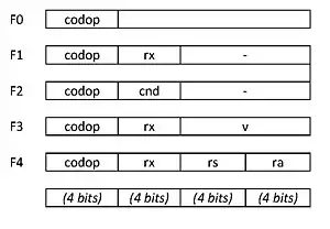 En la Figura 3, cada operando que comienzan por r representa un registro (r0 a rF), el operando v corresponde a un valor inmediato de 8 bits, y cnd hace alusión a un código de condición de salto o llamada a subrutina de acuerdo con los códigos que se dan en la Figura 4.