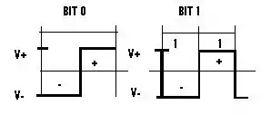 • El bit 0:se codifica con un cambio de polaridad negativa a positiva (V- a V+), en la mitad del intervalo del bit.