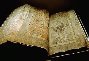 El Codex Gigas, también conocido como Códice Gigas o la biblia del diablo, es un antiguo manuscrito medieval en pergamino creado a principios del siglo xiii y escrito en latín presuntamente por el monje Germán el Recluso del monasterio de Podlažice (en Chrudim, centro de la actual República Checa). Fue considerado en su época como la «octava maravilla del mundo» debido a su impresionante tamaño (92 × 50,5 × 22 cm, el manuscrito medieval más grande conocido), su grosor de 624 páginas y su peso de 75 kg.[1] Está iluminado con tintas roja, azul, amarilla, verde y oro, tanto en mayúsculas capitales como en otras páginas, en las que la miniatura puede ocupar la página completa. Se encuentra en un excelente estado de conservación.