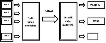 Tal como se puede observar en la figura, el codificador multivista recibe N secuencias de vídeo sincronizadas temporalmente y genera un único flujo que es almacenado o transmitido a través del canal hasta llegar al decodificador. Dicho decodificador se encarga de recibir el flujo de bits, decodificarlo y obtener las N señales de vídeo resultantes.