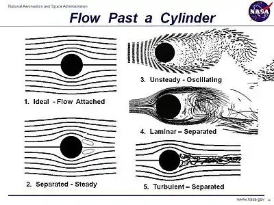 •3: Flujo separado no estacionario, poseyendo una corriente laminar de capa límite antes de la separación, y produciendo una calle de vórtices,