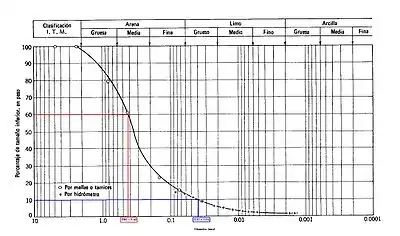 - D10 = el diámetro o tamaño por debajo del cual queda el 10% del suelo, en peso.